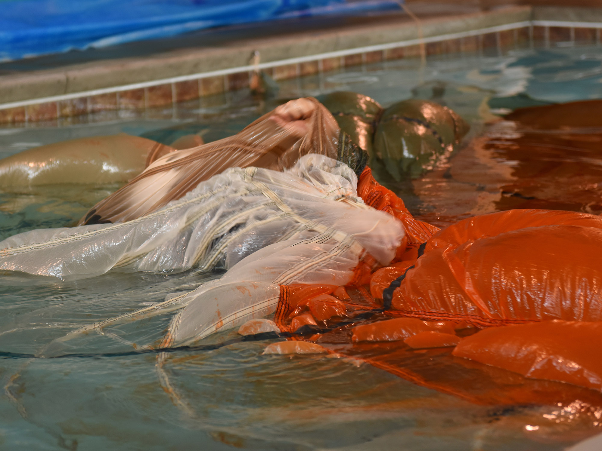 Parachute Drop Disentanglement Trainer (PDDT) permite echipajelor aeriene să exerseze procedurile de dezangajare din suspantele și calota parașutei, în situația în care parașuta ajunge deasupra acestora la contactul cu apa. După o dezangajare reușită, cursantul se îndepărtează înot de parașută și urcă într-o plută de salvare pentru o singură persoană, fixată de marginea bazinului printr-o coardă.